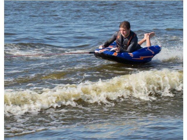 Een funtube waar met op kan liggen, zitten of op de knieën kan zoeven over het water. Gegarandeerd plezier.