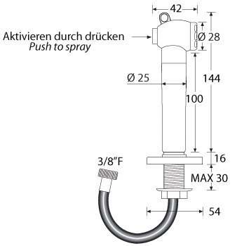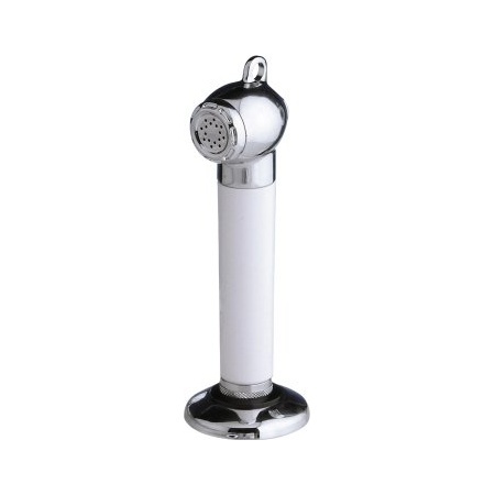 Hekdouche met ingebouwde sokkel en 2 m plastic slang. Het water kan worden in- en uitgeschakeld met de drukknop op de douchekop.
