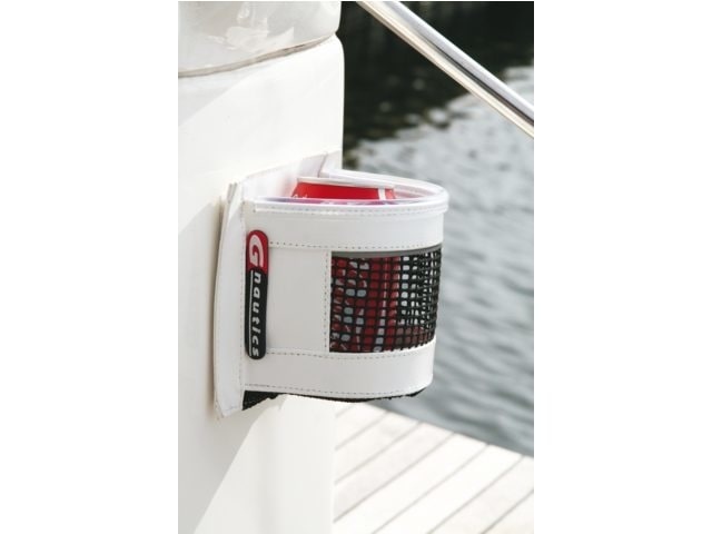 Een slimme bekerhouder van wit PVC en zwarte PU Mesh voor het opbergen van 1 of 2 bekers. Klittenband fixatie op rugzijde voor het monteren zonder boren.