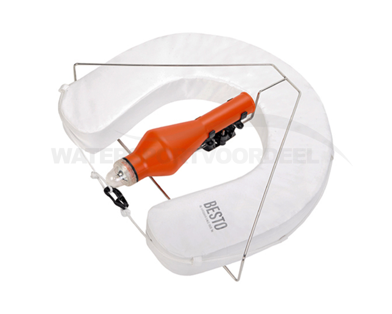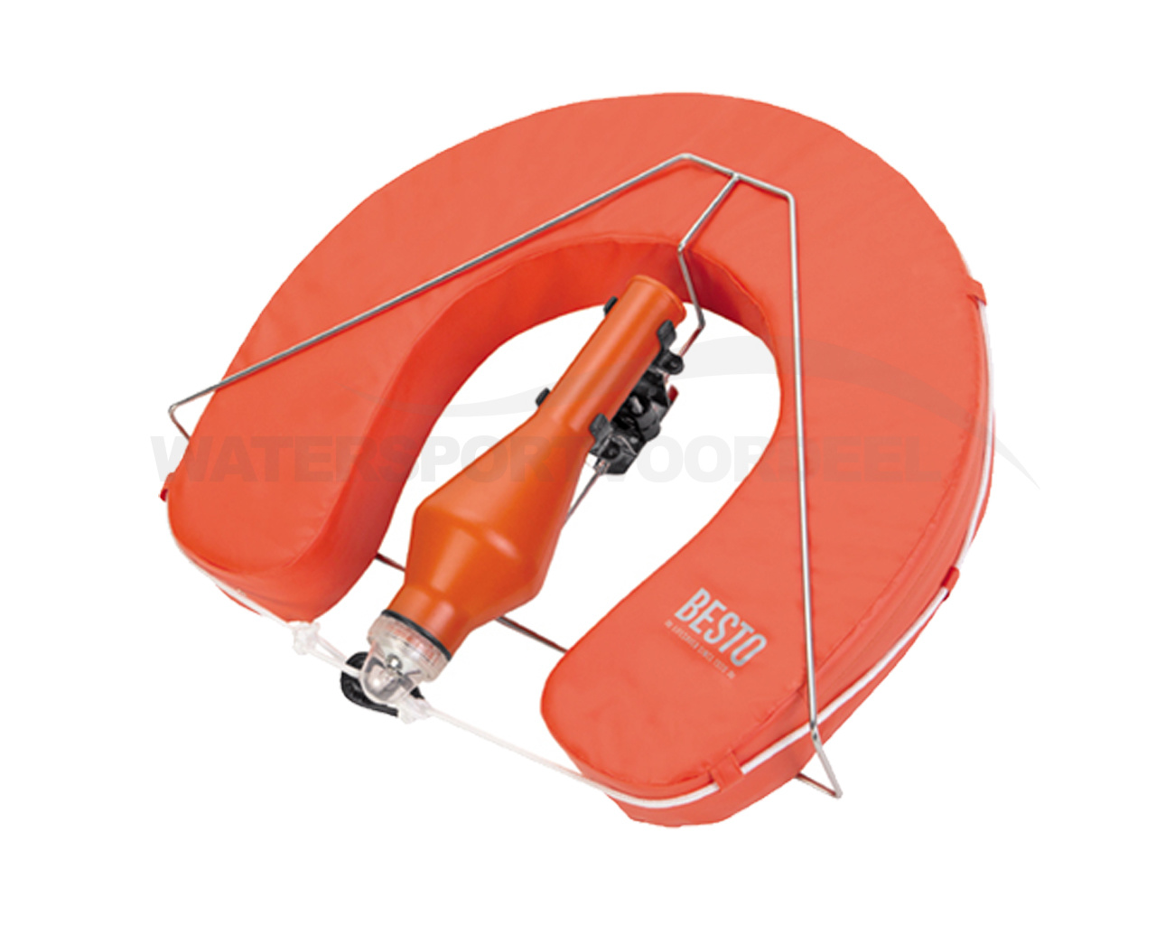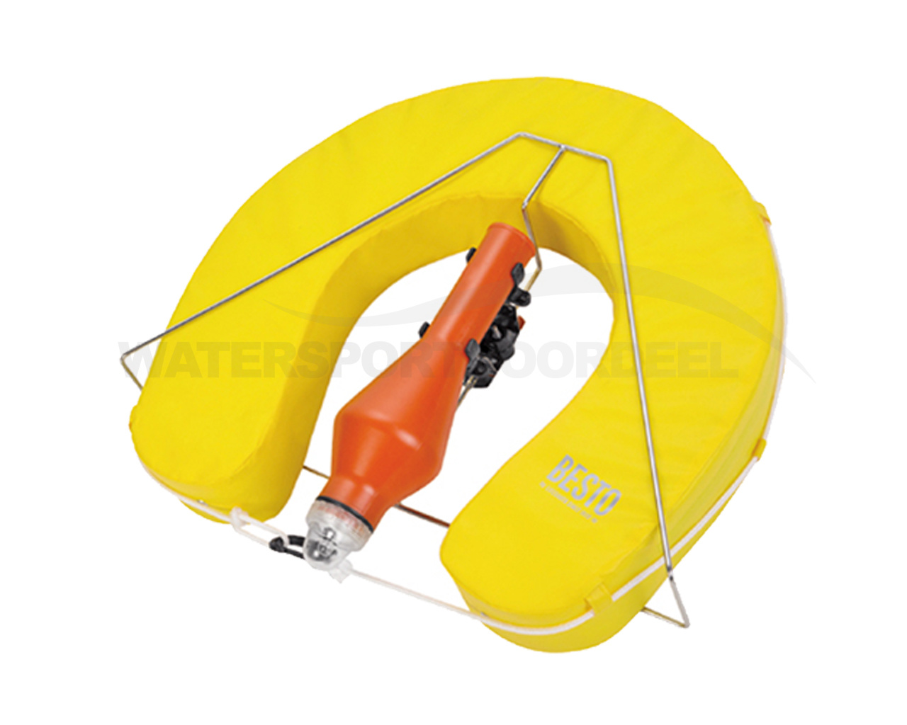 Hoefboei voorzien van een sterke wipe clean hoes. Vulling is een zachte schuim met gesloten cel. Complete set bestaande uit een 100N Hoefboei, reddingsboei knipperlicht, RVS beugel met dubbele kunststof klem voor het licht. Wordt geleverd met railconnector.