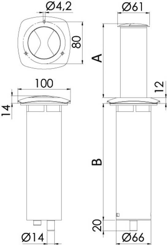 Gelijk met het tafelblad wanneer uitgeschakeld, springt het eruit en licht automatisch op door de roestvrijstalen bovenste ring iets te draaien. Bovenelement van glanzend gepolijst AISI316 roestvrij staal.