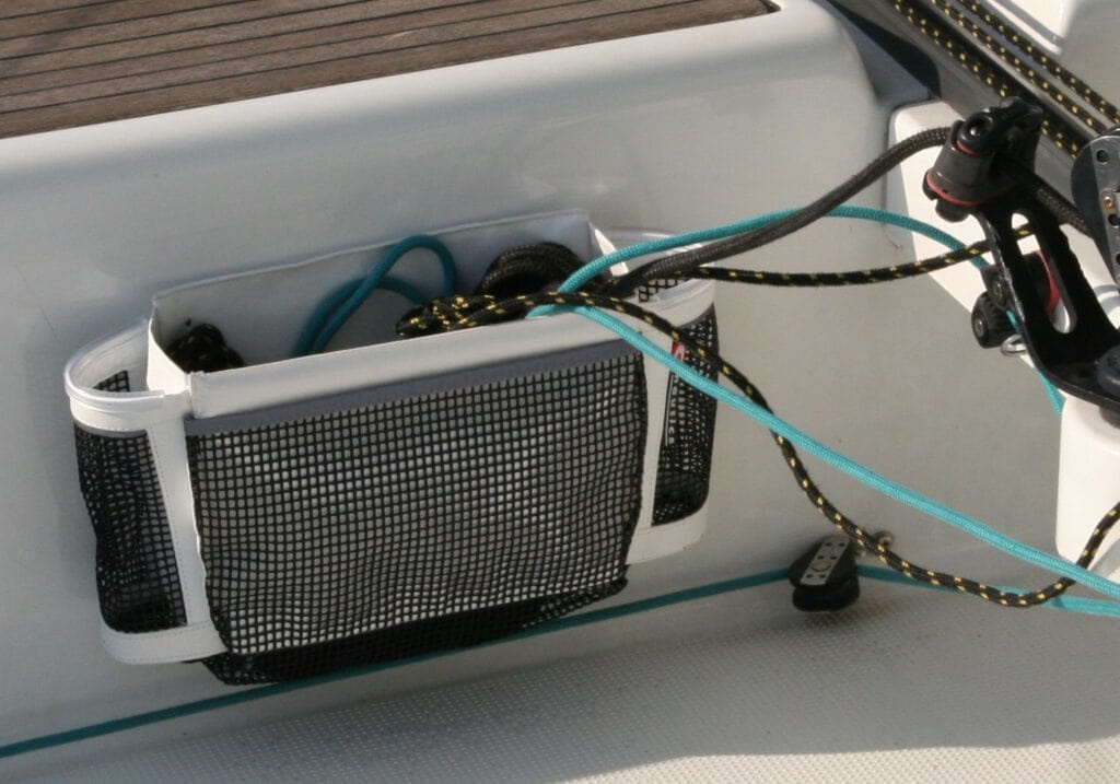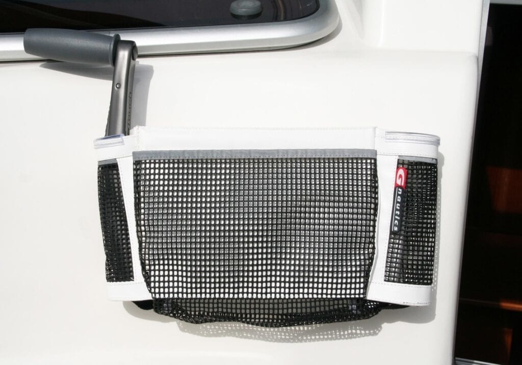 Een Handige bootspullen tas gemaakt van wit PVC en zwarte PU Mesh met links of rechts geïntegreerde lierhendelhouders. Geschikt voor het opbergen van vele bootspullen. Naar keuze Velcro of schroef fixatie.