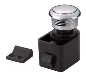 Een zwarte druksloten gemaakt van plastic. Met knop gemaakt van verchroomd messing.