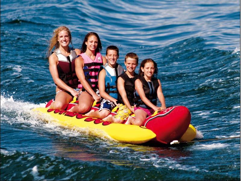 Grootste FunTube Hotdog in zijn klasse, met maar liefst 5 zitplaatsen. Maxi-hotdog. Gemaakt van elektrisch gelast PVC + nylon cordura + neopreen bescherming. Voorzien van speciaal snel opblaas/leeg ventiel.