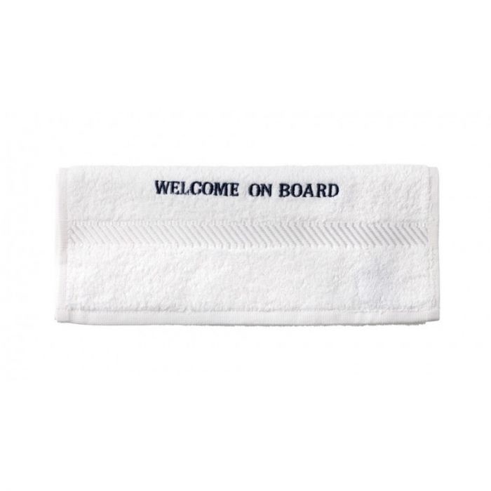 De tekst Welcome on Board staat op het gastendoekje geborduurd.