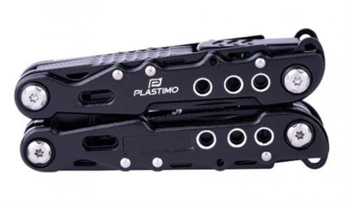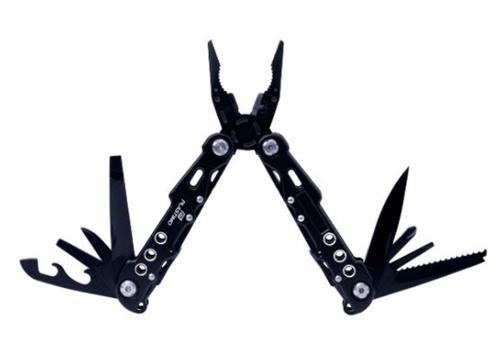 Zwart geanodiseerd aluminium multitoolmes (20 stuks) met veiligheidsvergrendeling: mes, zaag, tang, draadknipper, vijl, spike, flesopener, blikopener, 2x platte schroevedraaier en kruiskopschroevendraaier.