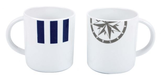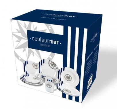Een Wit serviesgoed met grijs en blauw decor met windroos. De set is vaatwasserbestendig.