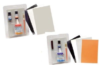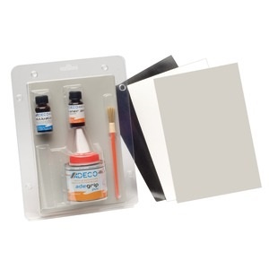 set bestaande uit 125 ml lijm met katalysator + 2 vellen neopreenweefsel 14,5x21,5 cm + kwastje + schuurpapier + gebruiksaanwijzing.