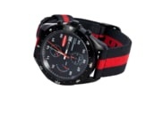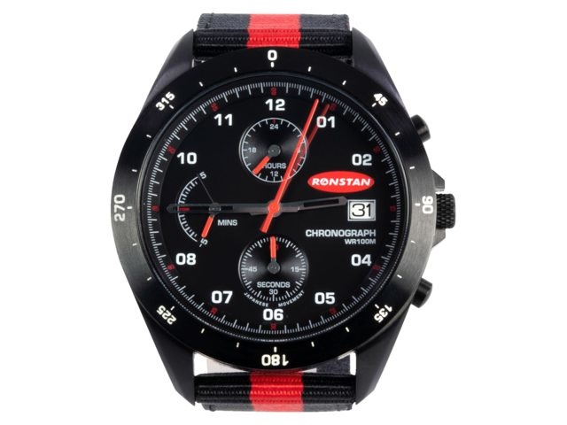 De analoog starthorloge quartz chronograph heeft een 43mm mat zwart geborsteld RVS behuizing. Met een hard mineraal kristallen lens. 12 en 24 uurs display met datum. De 22mm nylon band met RVS pins draagt fijn om de pols. Inclusief Stopwatch functie (60 sec en 10 min) en Timer (5 minute count down). Het starthorloge is Water resistant tot 10ATM (100m/300ft)