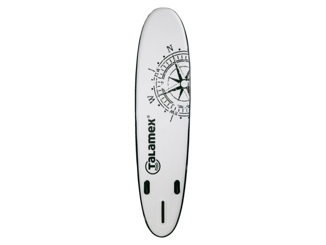 Deze supboard 10.6 Compass van Talamex is een 15 centimeter dikke SUP. Het board is ontwikkeld voor de ervaren SUP-per met een maximaal gewicht van ongeveer 100kg. Het board is gefabriceerd van double layer drop-stitch PVC, deze dubbele laag PVC doek zorgt voor extra stijfheid en bovendien wordt de levensduur van de SUP aanzienlijk verlengt. De SUP is voorzien van een zachte handgreep, twee RVS D-ringen en een elastiek om eventuele bagage vast te kunnen zetten. Het board is op te blazen tot maximaal 18psi.