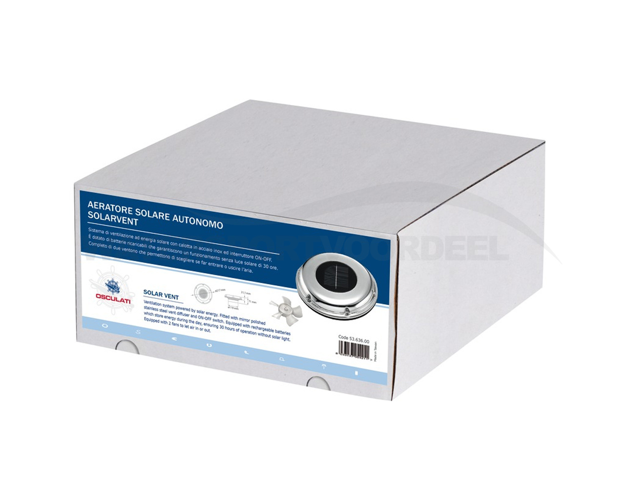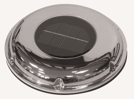 Het handigste ventilatiesysteem op zonne-energie. Uitgevoerd met spiegeldiffuser in gepolijst roestvrij staal. De ventilator heeft een Aan / uit knop. Uitgerust met NiMH-oplaadbare batterijen die overdag energie opslaan, waardoor er 30 uur zonder zonlicht wordt gewerkt. Uitgerust met 2 RIGHT / LEFT-ventilatoren om de lucht naar binnen of naar buiten te laten gaan.